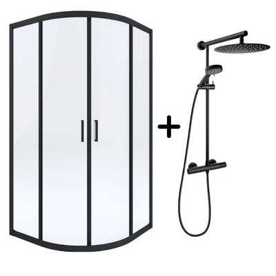 Set cabina dus neagra semirotunda 80x80 cm plus coloana dus cu termostat negru mat FDesign Anima