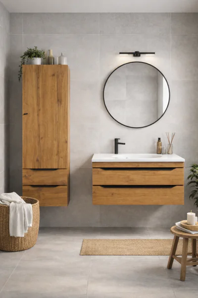 Set mobilier baie complet KolpaSan Malaya stejar natur cu lavoar compozit, dulap suspendat si oglinda